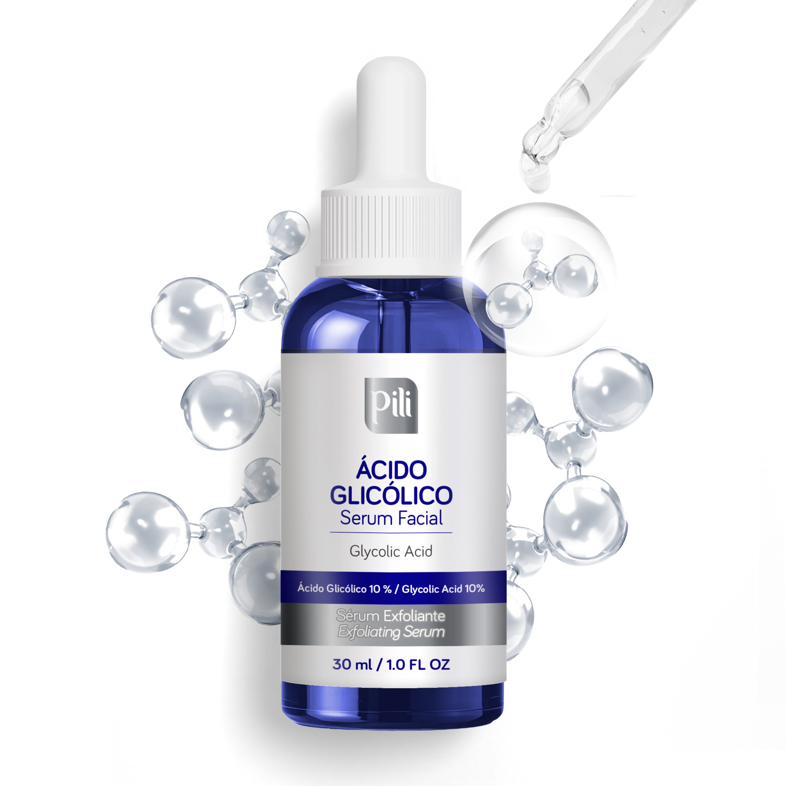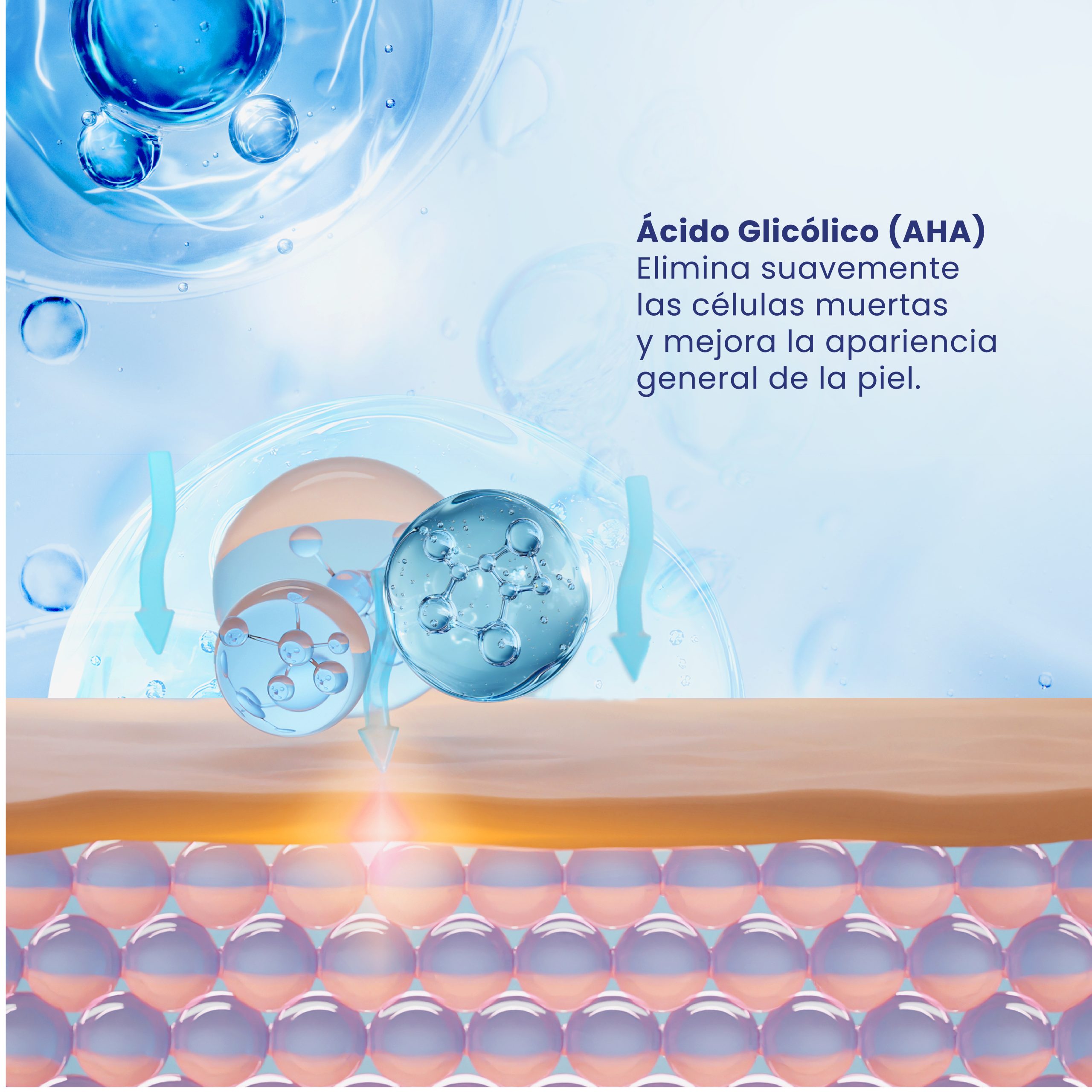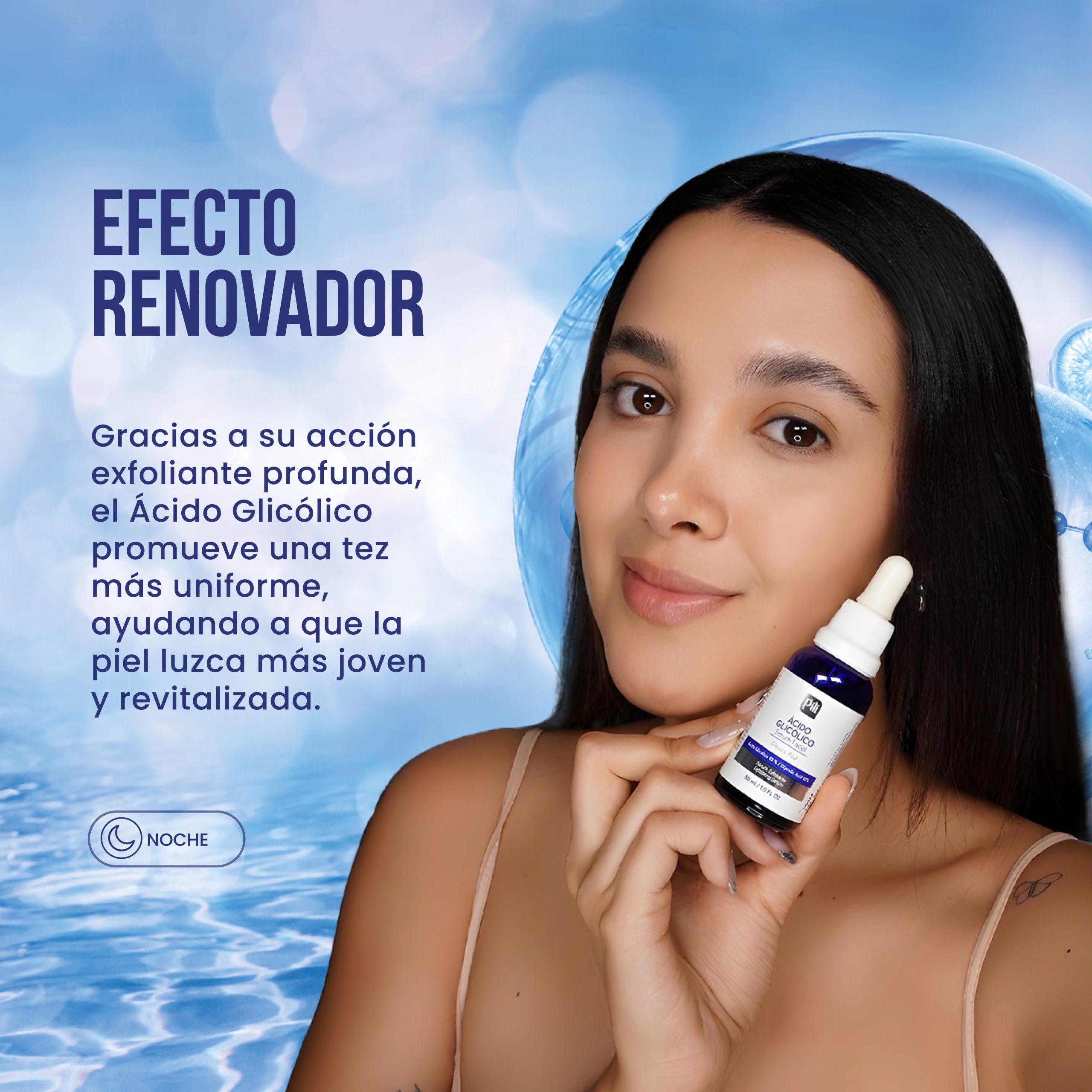 Ácido glicólico 10%: Libera la piel de células muertas. Efecto regenerador de la piel desde las capas profundas, acelerando el desprendimiento de capas superficiales que están deterioradas. Ayuda a evitar signos del envejecimiento y suaviza líneas de expresión.