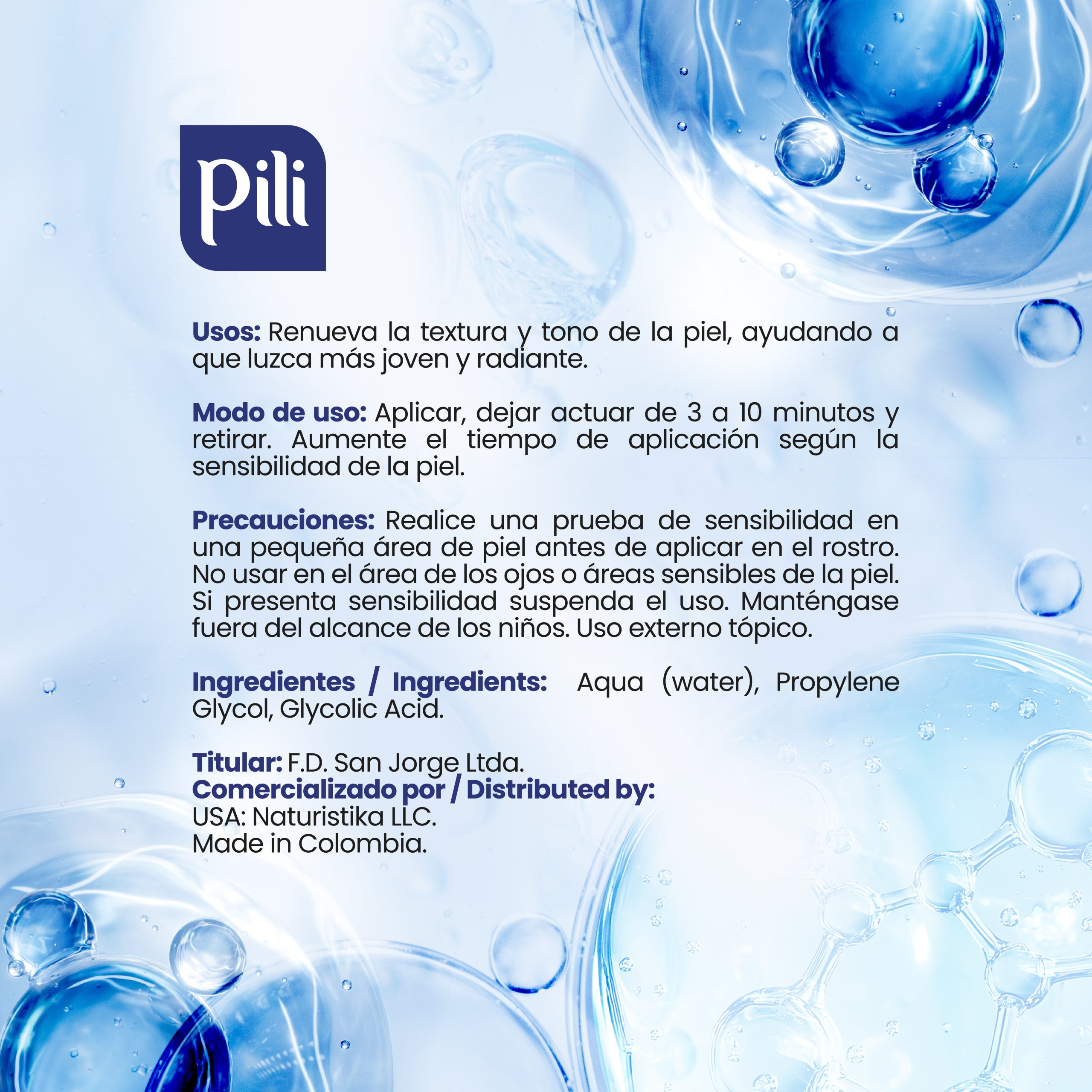 Precauciones: No ingerir, uso externo. No aplicar en personas sensibles al ácido glicólico. Evitar contacto con los ojos y mucosas. En caso de que esto ocurra enjuagar con abundante agua. Si presenta sensibilidad a alguno de los productos, suspenda su uso.