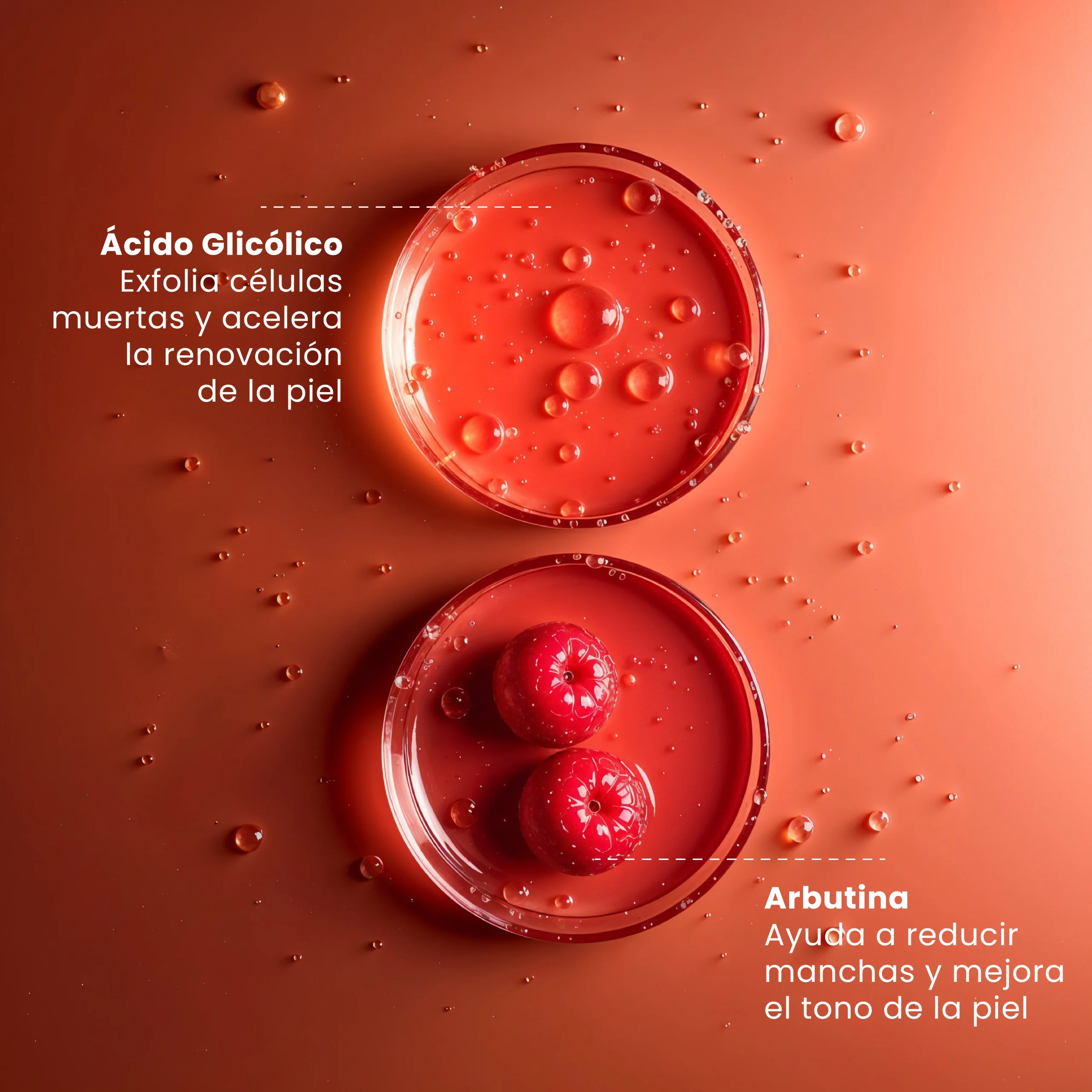 ✅ Ácido Glicólico: un alfa hidroxiácido que favorece la exfoliación de las células muertas y acelera la renovación celular, ayudando a reducir las manchas superficiales y a mejorar la textura de la piel.